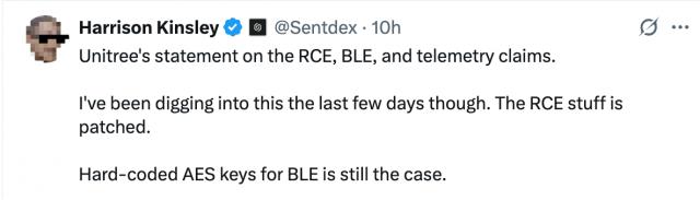 发现这一漏洞的安全研究者 Andreas Makris 和 Kevin Finisterre 表示,早在今年 5 月刚发现这个漏洞时,他们就把这件事告诉了宇树团队,希望宇树推进修复。