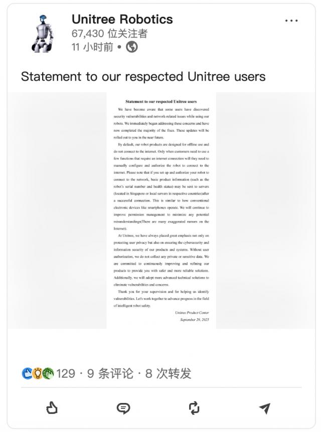"我们已经了解到,一些用户在使用我们的机器人产品时发现了系统安全漏洞和网络相关问题。我们立即着手解决这些问题,并且目前已经完成了大部分的修复工作。这些更新将在不久的将来陆续推送给您"