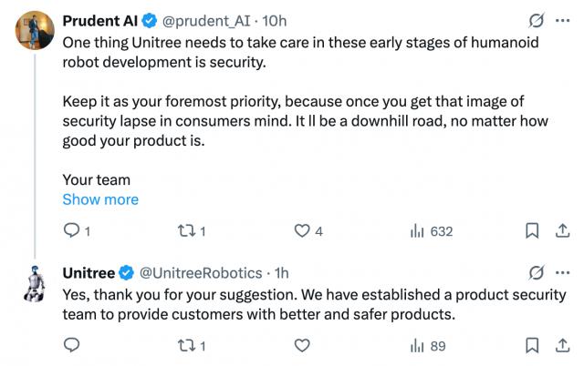 宇树很快回复了该网友,称其提醒得对,且公司"已成立产品安全团队,为客户提供更优质、更安全的产品"。