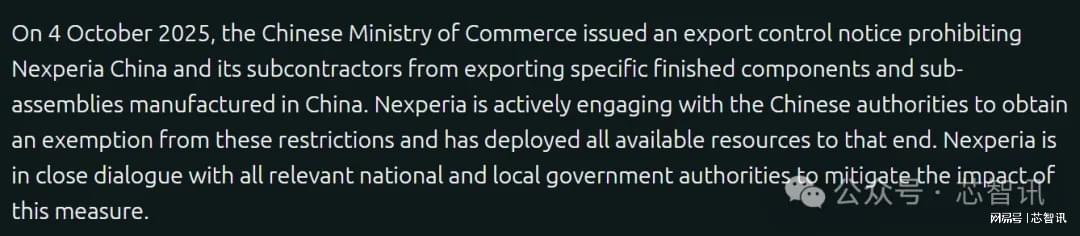 安世半导体在一份声明中表示,中国商务部本月早些时候发布出口管制通知,禁止安世半导体及其分包商出口特定成品元器件和组件。安世半导体表示,正积极与中国政府部门沟通,以争取获得相关限制的豁免,并已为此调动一切可用资源。目前,公司正与所有相关中央及地方政府部门保持密切对话,以减轻该措施造成的影响。