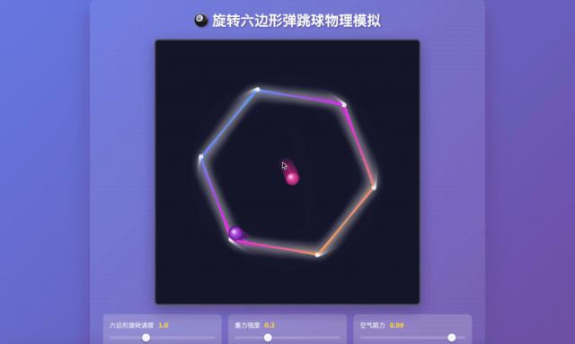 显示球在旋转的六边形内弹跳。球应该受到重力和摩擦力的影响,并且必须逼真地从旋转的墙壁上反弹。